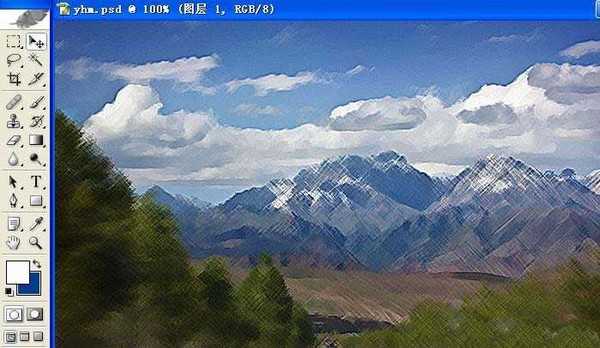 6、【阴影线】滤镜确定后,可看到风景图片添加上滤镜的效果了,如下图所示。一张图片在用滤镜前,最好复制一个副本在图层中,这样好对比看效果。