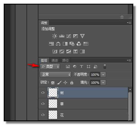 2、在图层面板,图层选项的下方,当前显示的是:类型